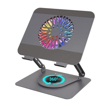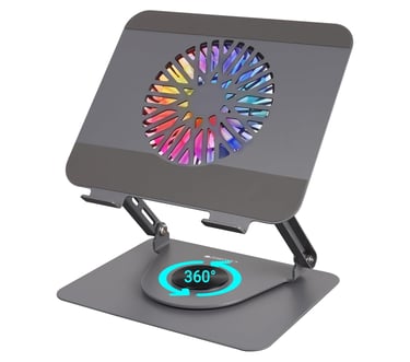 A laptop stand raises the screen to eye level.